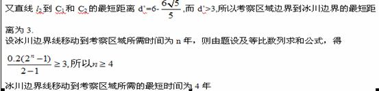 是冰川的部分边界线(不考虑其他边界),当冰川融化时,边界线沿与其垂直的方向朝考察区域平行移动,第一年移动0.2km,以后每年移动的距离为前一年的2倍,求冰川边界线移动到考察区域所需的最短时间.