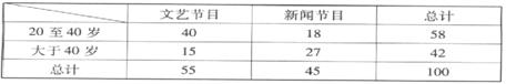 (广东卷文17)某电视台在一次对收看文艺节目和新闻节目观众的抽样调查中,随机抽取了100名电视观众,相关的数据如下表所示: