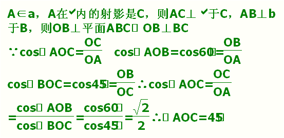 67. 直线a是平面α的斜线,b在平α内,已知a与b成60°的角,且b与a在平α内的射影成45°角时,a与α所成的角是( )