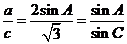 40.(2009湖北卷文) 在锐角△ABC中,a、b、c分别为角A、B、C所对的边,且![]()