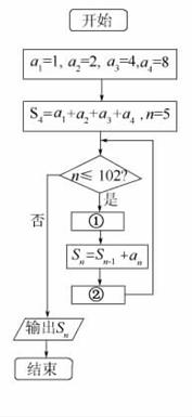 15.已知数列{an}的通项公式an=,计算其前102项和的算法流程图如图所示,图中①,②应该填__________、__________.