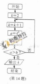 (14)某程序框图如图所示,则该程序运行后输出的k的值是_____________________。