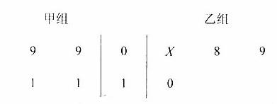 以下茎叶图记录了甲、乙两组各四名同学的植树棵树。乙组记录中有一个数据模糊,无法确认,在图中以X表示。