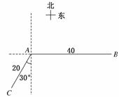 解:如题中图所示,在△ABC中,AB=40,AC=20,∠BAC=120°,由余弦定理知,BC2=AB2+AC2-2AB·AC·cos120°=2 800⇒BC=20.