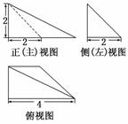 由三视图得几何体为四棱锥,如图记作S-ABCD,其中SA⊥面ABCD,SA=2,AB=2,AD=2,CD=4,且ABCD为直角梯形.∠DAB=90°,∴V=SA×(AB+CD)×AD=×2×(2+4)×2=4.