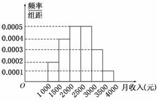 解析:从频率分布直方图,可以知道要使得两边的面积相等,平分面积的直线应该在2000-2500之间,设该直线的方程为x=a,则500×(0.0002+0.0004)+0.0005×(a-2000)=0.0005×(2500-a)+500×(0.0005+0.0003+0.0001),解得a=2400,即居民的月收入的中位数大约是2400.
