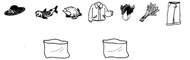 帮妈妈把买的东西分在两个袋里,用线连一连。