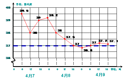 2、这位病人的体温最高是多少摄氏度?最低是多少摄氏度?他在4月8日12时的体温是多少摄氏度?