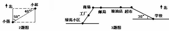 A、北偏东50° B、东偏北50° C、西偏南40°