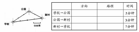 1、根据路线图,说说小明参加比赛所经过的方向和路程,完成下表: