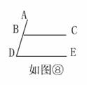 11、(12′)如图⑧,BC∥DE,小颖用量角器分别画出∠ABC、∠ADE的角平分线BG、DH,想一想,小颖所画的这两条射线BG和DH会平行吗?为什么?(请你先用量角器画出这两条角平分线)