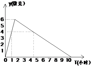 1.在全国抗击“非典”的斗争中,黄城研究所的医学专家们经过日夜奋战,终于研制出一种治疗非典的抗生药,据临床观察:如果成人按规定的剂量注射这种抗生素,注射药液后每毫升血液中的含药量y(微克)与时间t(小时)之间的关系近似地满足下图所示的折线.