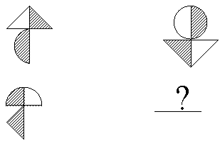 2. 在这幅图中,都是△、○、□,所以我们可以确定空白处也应是△、○、□,中的一种.通过观察每一行,又可以发现每一行都没有重复的图形,这时,我们就可以根据这个规律填出空白处的图形了.第一横行中有△、○,少□,所以空白处应为□. 第二横行中也有△、○,所以空白处也为□.所以,最后这幅图应为: