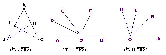10、如图,O是直线AB上一点,OD是∠AOC 的平分线,OE是∠COB的平分线,则∠DOE= º。