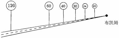 公里处有一个20公里/小时的标牌, 如果你从120公里/小时的标牌处出发一直以限定时速行驶, 那么需要( )才能到达布凯姆城.
