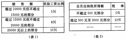 27、某商场为提高彩电销售人员的积极性,制定了新的工资分配方案,方案规定:每位销售人员的工资总额=基本工资+奖励工资。每位销售人员的月销售定额为10000元,在销售定额内,得基本工资200元;超过销售定额,超过部分的销售额按相应比例作为奖励工资。奖励工资发放比例如表1所示。