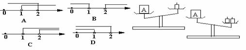 天平右盘中的每个砝码的质量都是1克,则物体A的质量m的取值范围在数轴上表示为( )
