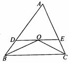 5.在三角形△ABC中,BO平分∠ABC,CO平分∠ACB,DE过O且平行于BC,如果△ADE的周长为10cm,BC=5cm,那么△ABC的周长是多少?并说清理由。(7分)