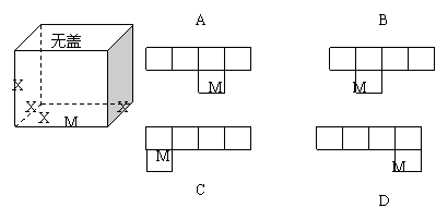 14 下图(一)是一个无盖的正方体纸盒,下底标有字母M,沿图中X线将其剪开展成平面图形,这个平面图形是( )