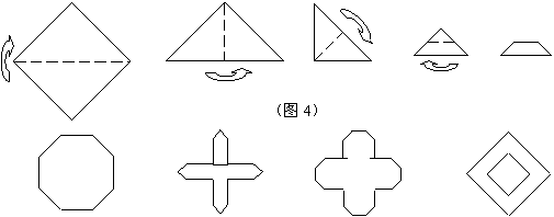 15、如图4所示,把一个正方形纸片三次对折后沿虚线剪开,则剩余图形展开后得到的图形是 ( )