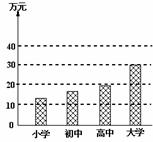 (10分)国家统计局最近公布的《首次中国城市居民家庭财产调查总报告》显示,截止2002年6月底,我国城市居民家庭财产总值户均达22.83万元。其中户主文化程度为小学、初中、高中、大学毕业的户均财产数值如上图所示:
