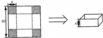 19、用边长60cm的正方形铁皮做一个无盖水箱,先在四个角分别截去一个小正方形,然后把四边翻转90°角,再焊接而成,如果截去的小正方形的边长是xcm,水箱的容积是ycm3,则因变量y与自变量x之间的关系式是_____ ____.