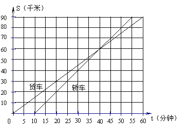 26、 (本题10分)如图, 货车和轿车先后从甲地出发,走高速公路前往乙地. 下图表示行驶过程中,他们的行驶路程(千米)与所用时间(分钟)的关系的图象. 已知全程为90千米,根据图象上的信息回答问题