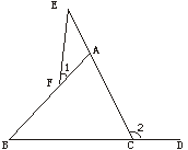 如图,已知△ABC,D在BC的延长线上,E在CA的延长线上,F在AB上,则∠1______∠2(填<,>或=)
