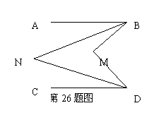 26、(10分)如图,AB∥CD,BN、DN分别平分∠ABM, ∠MDC,试问∠M与∠N之间数量关系如何?并说明理由。