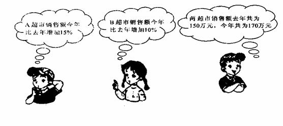 初一(3)班的一个综合实践活动小组去本镇的A、B两个超市调查去年和今年“五一节”期间的商品销售情况,下图是调查后小敏和其他两位同学交流的情况。根据他们的对话,你能知道A、B两个超市今年“五一节”期间的销售额吗?
