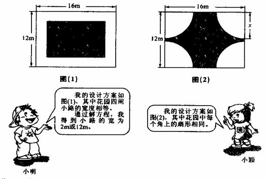 在一块长16cm,宽12cm的长方形荒地上,要建造一个花园,要求花园所占面积为荒地面积的一半。下面分别是小明和小颖的设计方案。