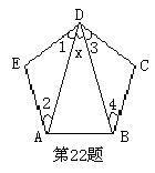 22、如图,五边形ABCDE的内角都相等,且∠1=∠2,∠3=∠4,求x的值。