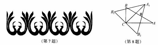 8.如图,在直角三角形ABC中,∠ACB=90O,∠A=30O,先以点C为旋转中心,将ΔABC按逆时针方向旋转45O,得ΔA1B1C1.然后以直线A1C为对称轴,将ΔA1B1C1轴对称变换,得ΔA1B2C,则A1B2与AB所成的∠α的度数为 .