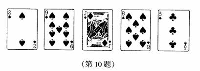 ( )10.下列扑克牌中,以牌的对角线交点为旋转中心,旋转180O后能与原图形重合的有: