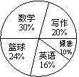 (8分)某校七年级(一)班共有50名学生,分别参加了写作、数学、英语、篮球及摄影兴趣小组,每个学生必须参加且只能参加其中一种,请根据如图所示的扇形统计图,求: