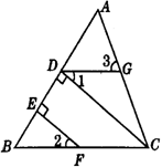 3、如图,CD⊥AB于D,点F是BC上任意一点,FE⊥AB于E,且∠1=∠2,∠3=80°.求∠BCA的度数.(11分)