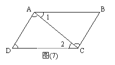 14、如图(7),已知∠1=∠2,∠BAD=∠BCD,则下列结论(1)AB//CD;(2)AD//BC;(3)∠B=∠D;(4)∠D=∠ACB。其中正确的有( C ).