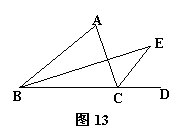25、如图13,D是BC的延长线上的一点,∠ABC和∠ACD的平分线交于点E,∠A = 60º, 则∠E = 。