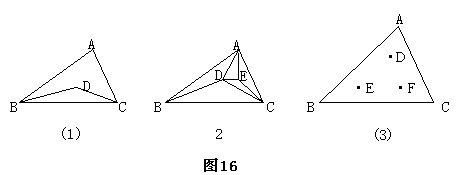 (1)、如图16(3),△ABC内有三个点D、E、F,分别以A、B、C、D、E、F六点为顶点画不重叠的三角形,最多可以画多少个?(4分)