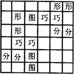 例2:将下图分成四个全等的图形,而且每一份图形中恰好有“巧分图形”四个字.