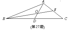 27. 如图,O是△ABC两条中线AD和BE的交点,请你找出面积相等的四对图形,并对其中的一对图形说说它们的面积为什么是相等的.(注:根据说理的难易程度,可能会得到附加分3分)