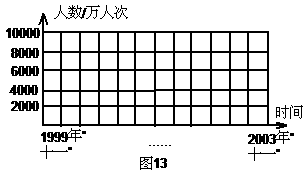 ⑴请画出国内旅游人数折线统计图;⑵12个黄金周国内旅游人数累计多少亿人次?⑶估计2003年“五一”黄金周的国内旅游人数和旅游收入(因受非典影响,2003年“五一”黄金周被迫取消),并说明理由。