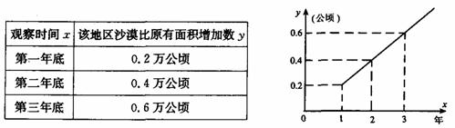 9.全世界每年都有大量土地被沙漠吞没,改造沙漠,保护土地资源,已成为一项十分紧迫的任务,某地区沙漠原有面积为100万公顷,为了解该地区沙漠面积的变化情况,连续3年进行观察,并将每年年底的结果记录如下表.根据这些数据制成统计如右图,发现连线呈直线状,并由图形看出该地区沙漠面积将继续按此趋势扩大。![]()