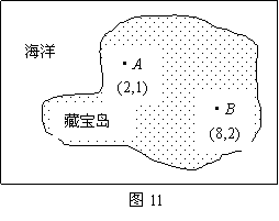 22,如图11是传说中的一个藏宝岛图,藏宝人生前用直角坐标系的方法画了这幅图,现今的寻宝人没有原来的地图,但知道在该图上有两块大石头A(2,1),B(8,2),而藏宝地的坐标是(6,6),试设法在地图上找到藏宝地点.
