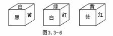 例4、如图3.3-6,下面三个正方体的六个面都按相同规律涂有红、黄、蓝、白、黑、绿六种颜色,那么涂黄色、白色、红色的对面分别是 ( )