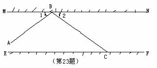 23.(7分)如图,MN、EF是两面互相平行的镜面,一束光线AB照射到镜面MN上,反射光线为BC,则∠1=∠2.