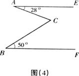 24、(8分)已知:如图(4),直线AE∥BF,∠EAC=28°,∠FBC=50°,求