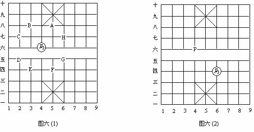 25. (8分)中国象棋中的马颇有骑士风度,自古有“马踏八方”之说,如图六(1),按中国象棋中“马”的行棋规则,图中的马下一步有A、B、C、D、E、F、G、H八种不同选择,它的走法就象一步从“日”字形长方形的对角线的一个端点到另一个端点,不能多也不能少。