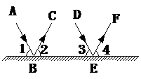 我们由光的镜面反射可知,当光线照射到平面镜上反射后,有入射角等于反射角。如图,∠3=∠4,∠1=∠2,当一束平行光线AB与DE射向水平镜面后被反射,反射光线BC与EF也平行吗?为什么?(6分)