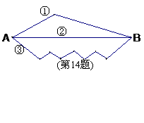 14、如图所示,从A村到B村有①②③三条道路,一般地,人们会走中间的直路②,而